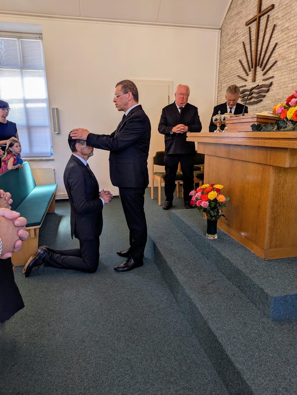 „Es ist heute ein Fest…“ leitete Apostel Kasper nach der Feier des Heiligen Abendmahls eine ganz besondere Freude ein und ordinierte Bruder Wolf-Dieter Hohn ins Priesteramt. Er bat den Priester „angstfreie Räume“ zu schaffen und jedem zu zeigen, dass die Gemeinde ein „sicherer Ort“ sei. Auf die Frage an die Gemeinde, ob sie ihren Priester annehme, erscholl im Anschluss an die Ordination ein herzliches „Natürlich!“